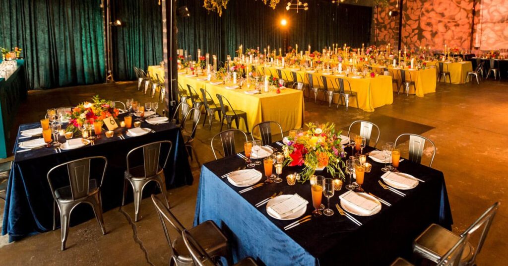 The venue is characterized by its exposed brick walls, soaring high ceilings and large, expansive windows that flood the space with natural light.
